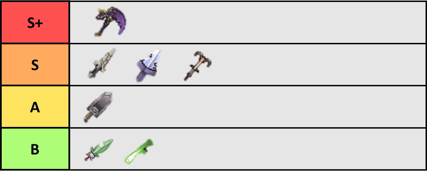 這一排的武器都具有不錯的素質,尤其是洛伊奈的傷害非常高;然而台服特別版取消了這些裝備的素材,故這三把都已絕版,只好放在S。