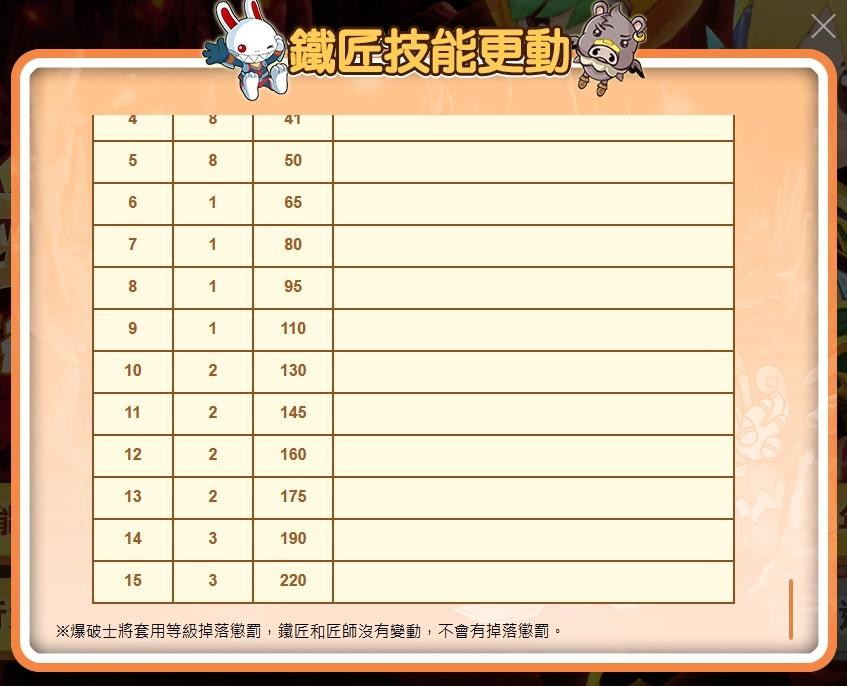 *爆破士將套用等級掉落懲罰,鐵匠和匠師沒有變動,不會有掉落懲罰。